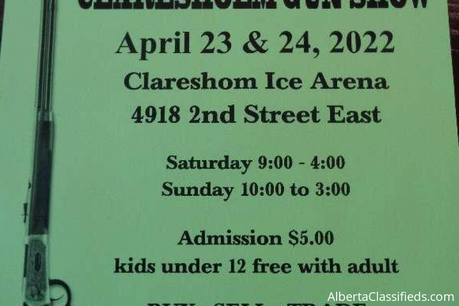 Claresholm Gun Show to be held on April 23,24 in the Claresholm Ice Arena located in Claresholm, Alberta. Come buy, sell and trade at the show.