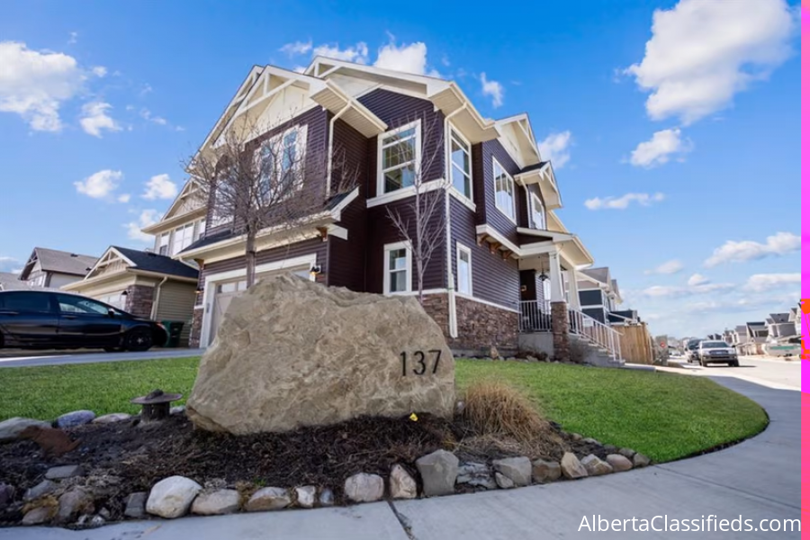 Welcome to the Genesis Built Avalon 2 model, a truly unique offering with its stunning floorplan situated on a corner lot just 1 block from the Nose Creek Elementary School and Canal. Walk into your sun-soaked main level and you are immediately impressed by the generous open floor plan featuring modern light fixtures, a large kitchen island, upgraded appliances, and a beautiful fireplace as the central focus. You have plenty of room to expand your seating area for large family gatherings, keep an eye on the kids in the south-facing backyard, and so many windows to expand your plant collection to a beautiful and quiet oasis. The upper level includes a large bonus room, private office area, laundry room with plenty of space for extra storage, two bedrooms and a 4 piece bath. The primary bedroom offers a walk-in closet, a double vanity ensuite with a large glass shower and a soaker tub. This beautiful home is an easy fit for the growing family with plenty of parking, a nice deck to enjoy your summer evenings, low maintenance landscaping, central air conditioning for a comfortable night's sleep and a stunning kitchen to enjoy with your friends and fantastic neighbours.